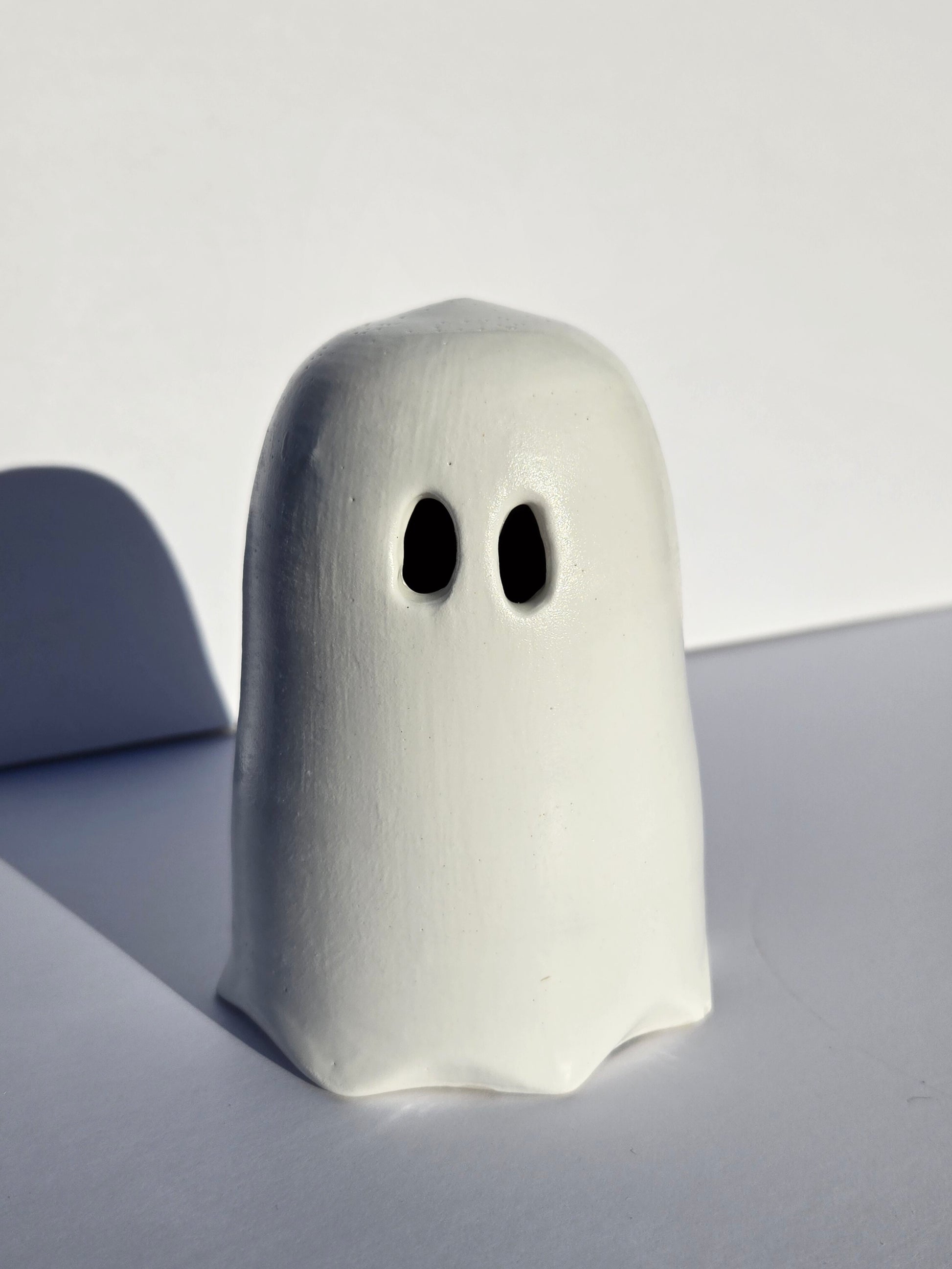 This handmade ceramic ghost luminaire stands about 4 inches tall and is ready to light up your spooky season with charm. Just place a tea light inside to cast a soft, magical nighttime glow, perfect for mantels, windowsills, or adding a touch of haunted cozy to your October nights.