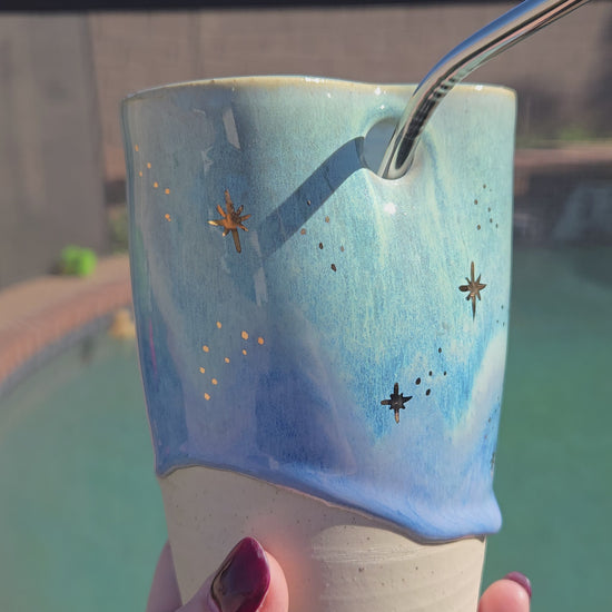 Tumblers are glazed with a creamy flowing soft turquoise and blue with gold luster accents.