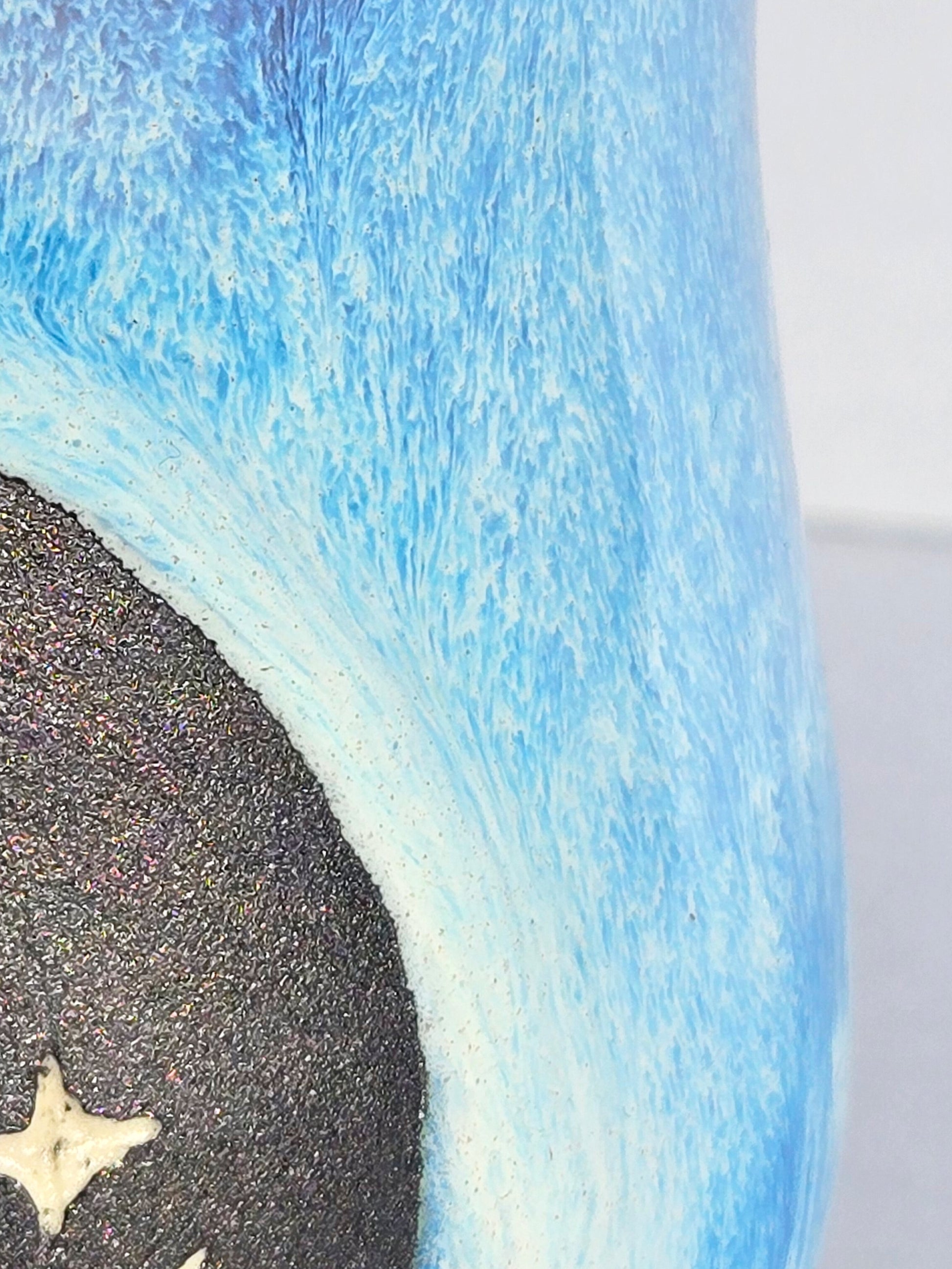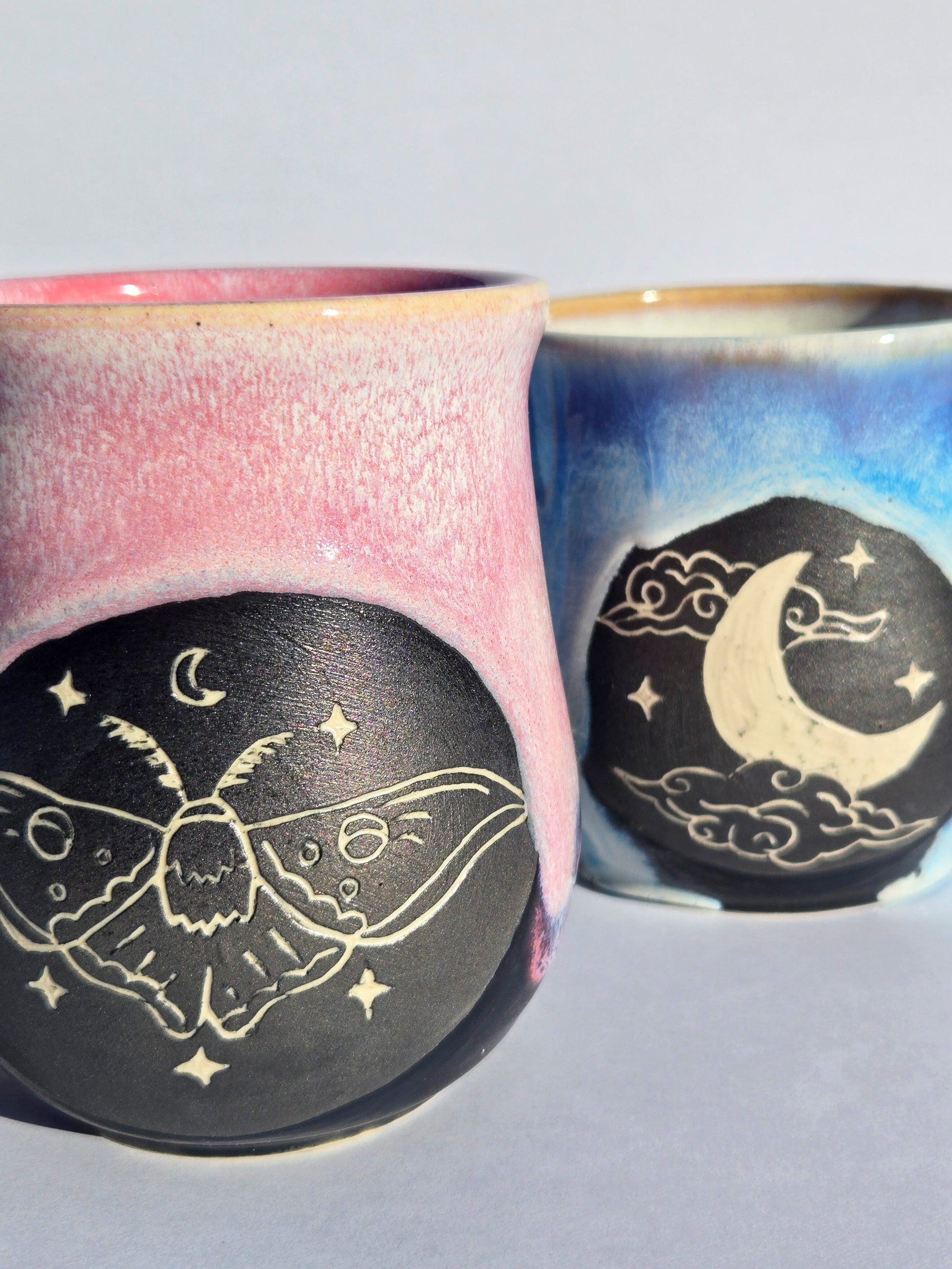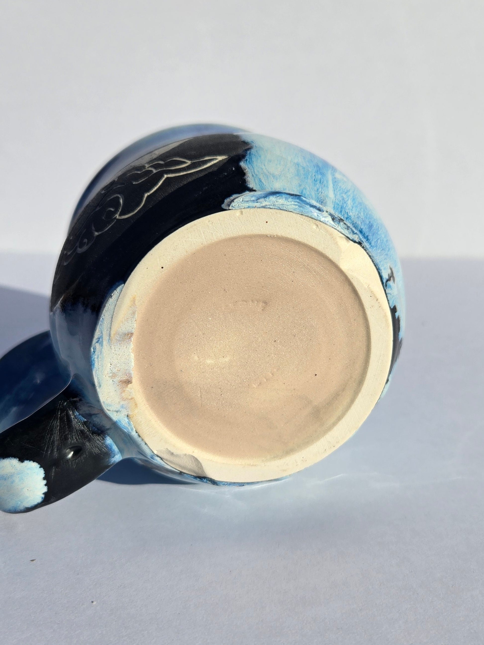 This wheel-thrown mug, standing around 4 inches tall, is glazed in a serene, flowing ice blue. It holds approximately 10–12 fl oz and is both dishwasher and microwave safe.