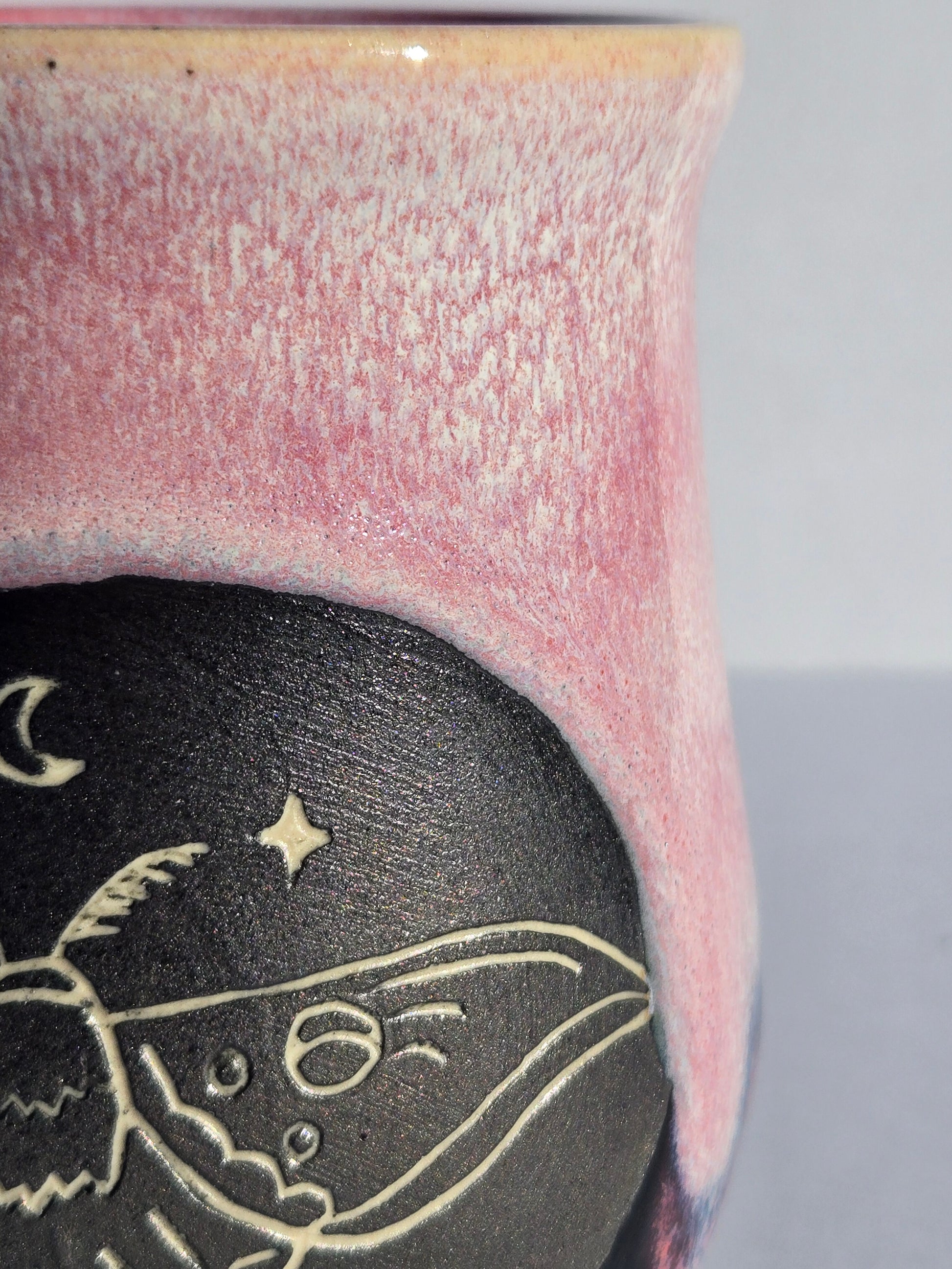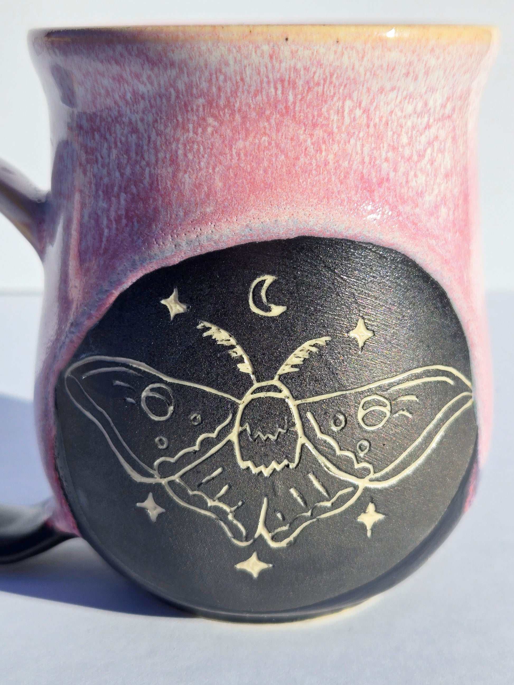 Sip your favorite brew with a touch of enchantment from our October collection this fall. Our wheel-thrown mug, adorned with a delicately hand-carved moth. Painted in a dreamy cascade of creamy pink glaze, it brings a sweetly, spooky charm to your daily ritual, whether hot coffee, tea, or a refreshing cold drink.