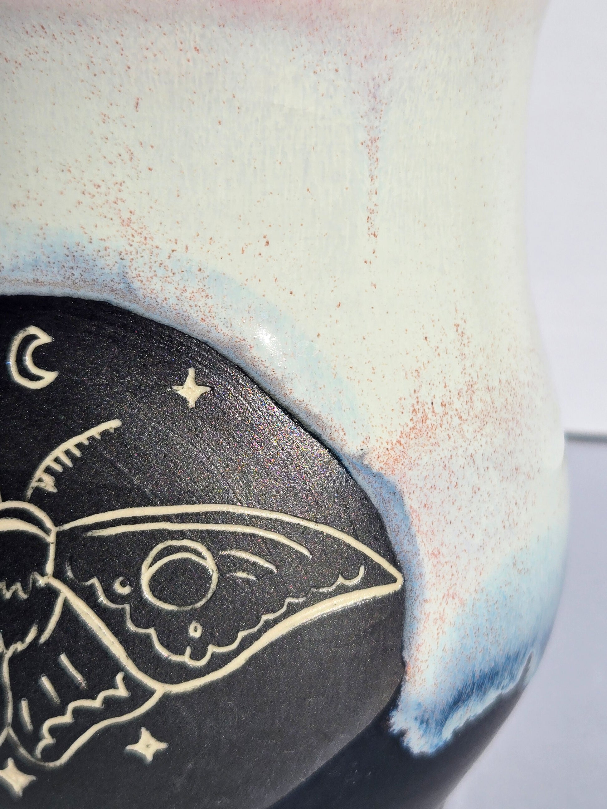 Sip your favorite brew with a touch of enchantment this fall with our October Collection. Our wheel-thrown mug, adorned with a hand-carved moth. Painted in a dreamy cascade of creamy glaze, it brings spooky charm to your daily ritual, whether hot coffee, tea, or a refreshing cold drink.